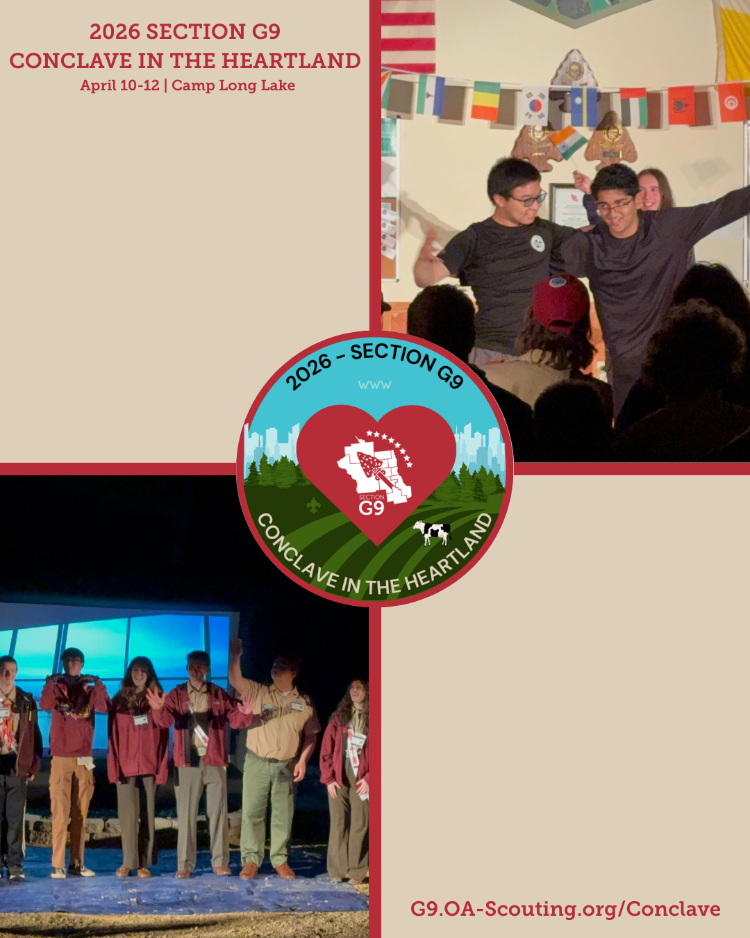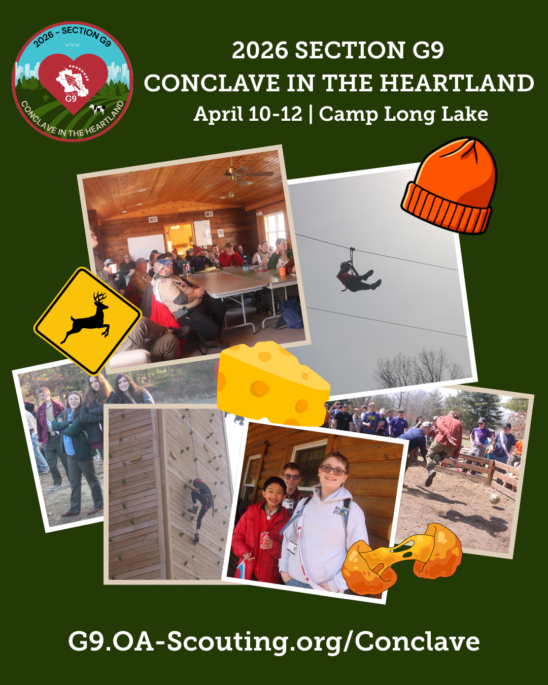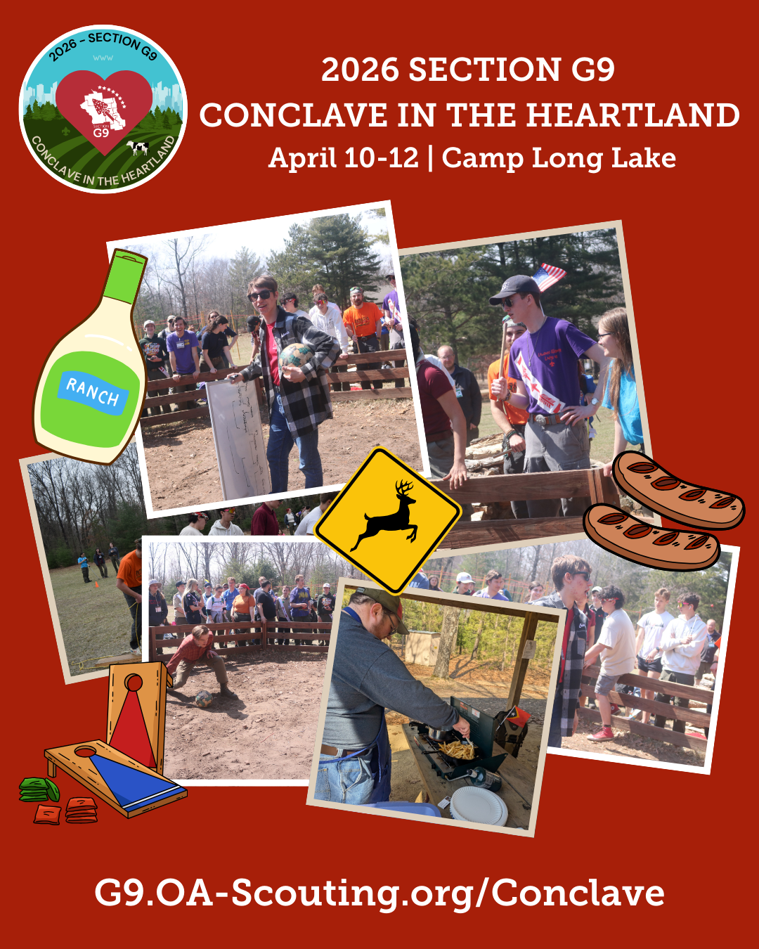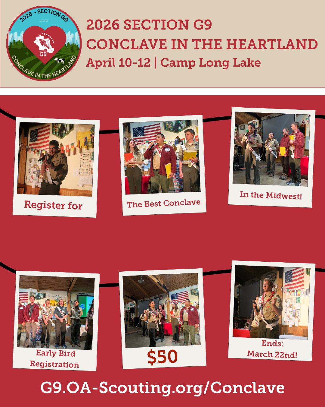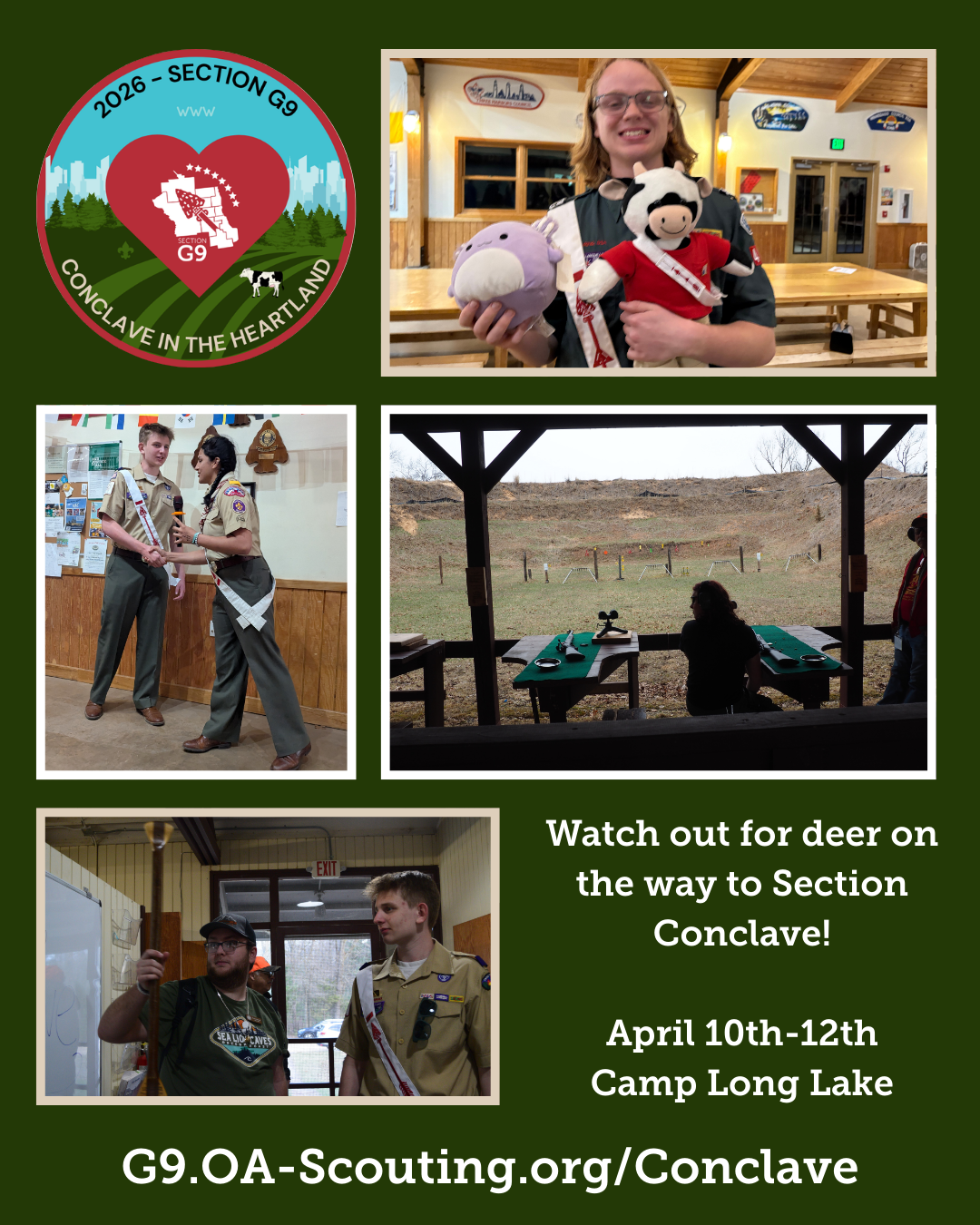 These materials are provided to help lodges and chapters promote the section conclave. Various materials have been created, ranging from OA Lodgemaster emails to social media posts for Instagram and Facebook. Any questions should be directed to the Conclave Promotions Committee at secretary@sectiong9.oa-bsa.org.