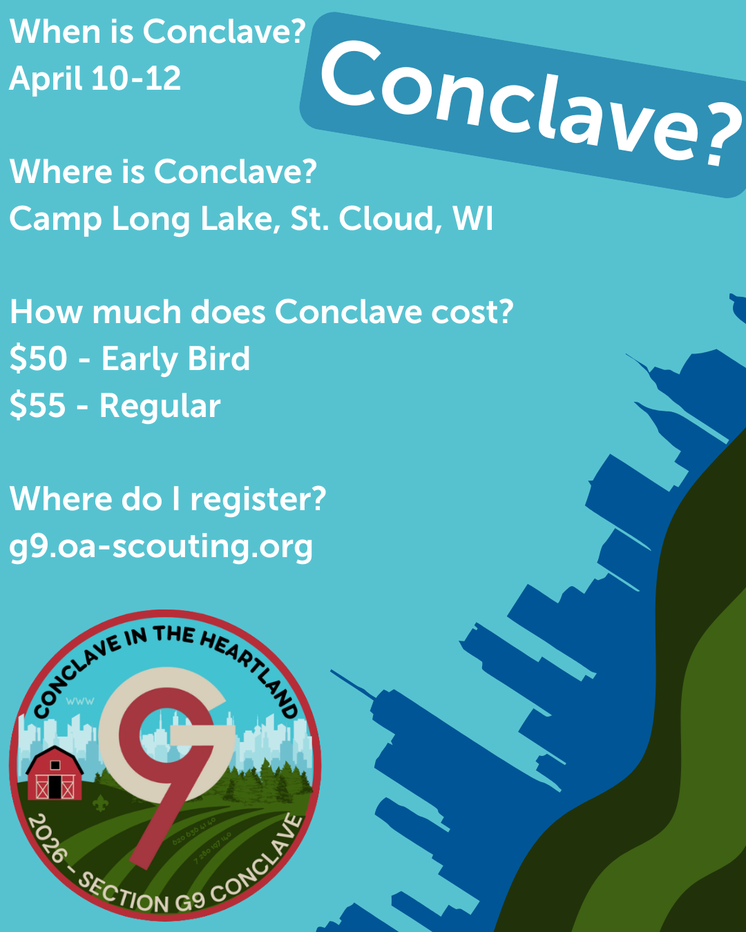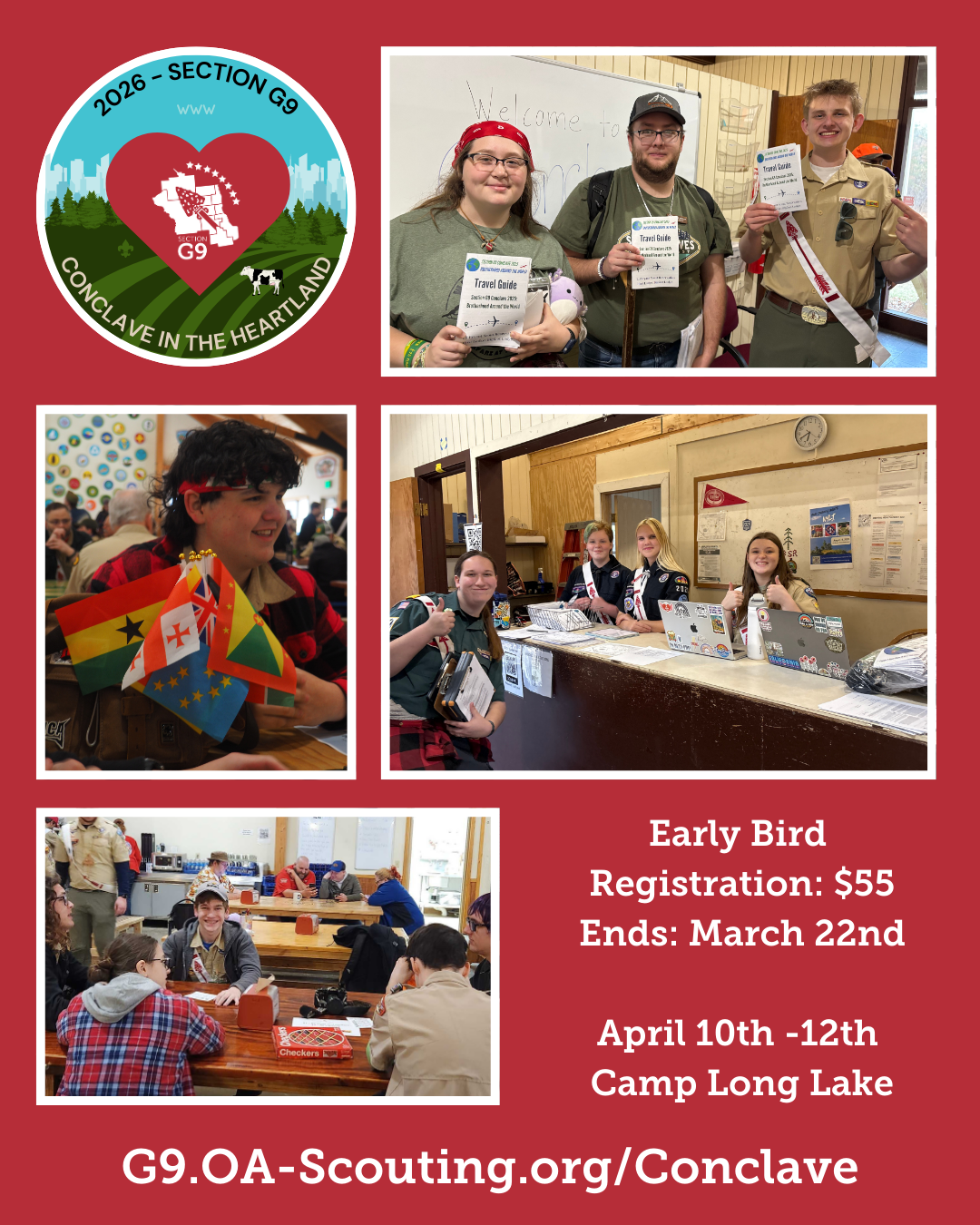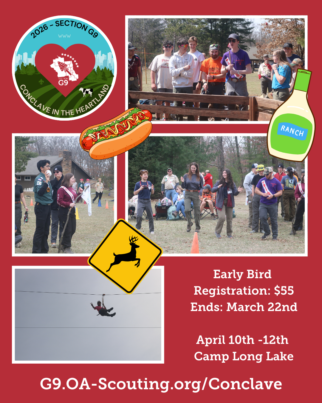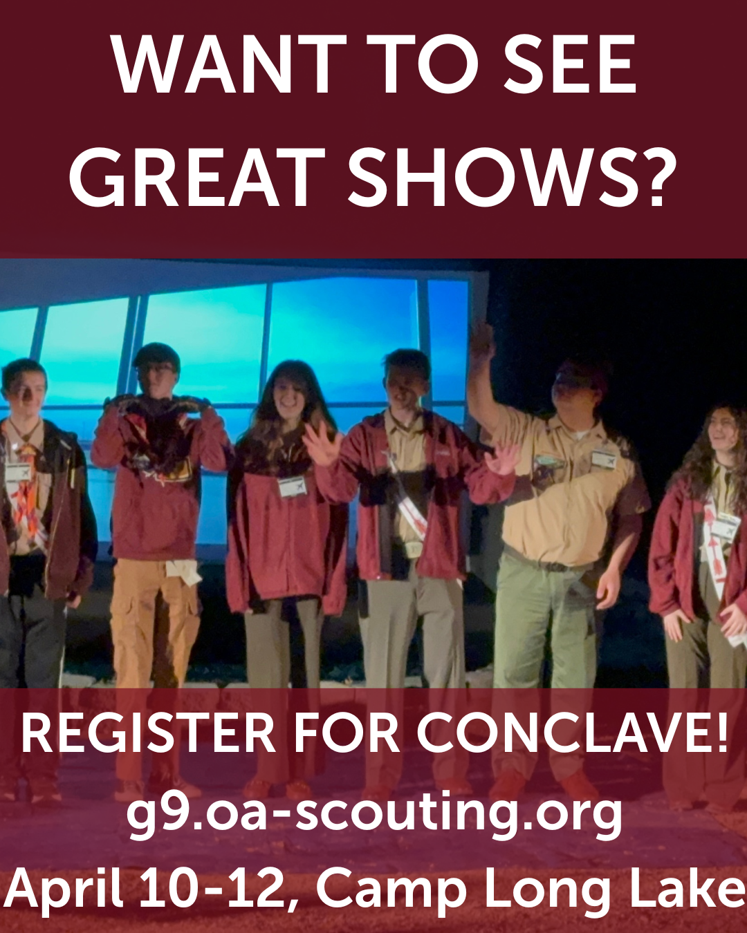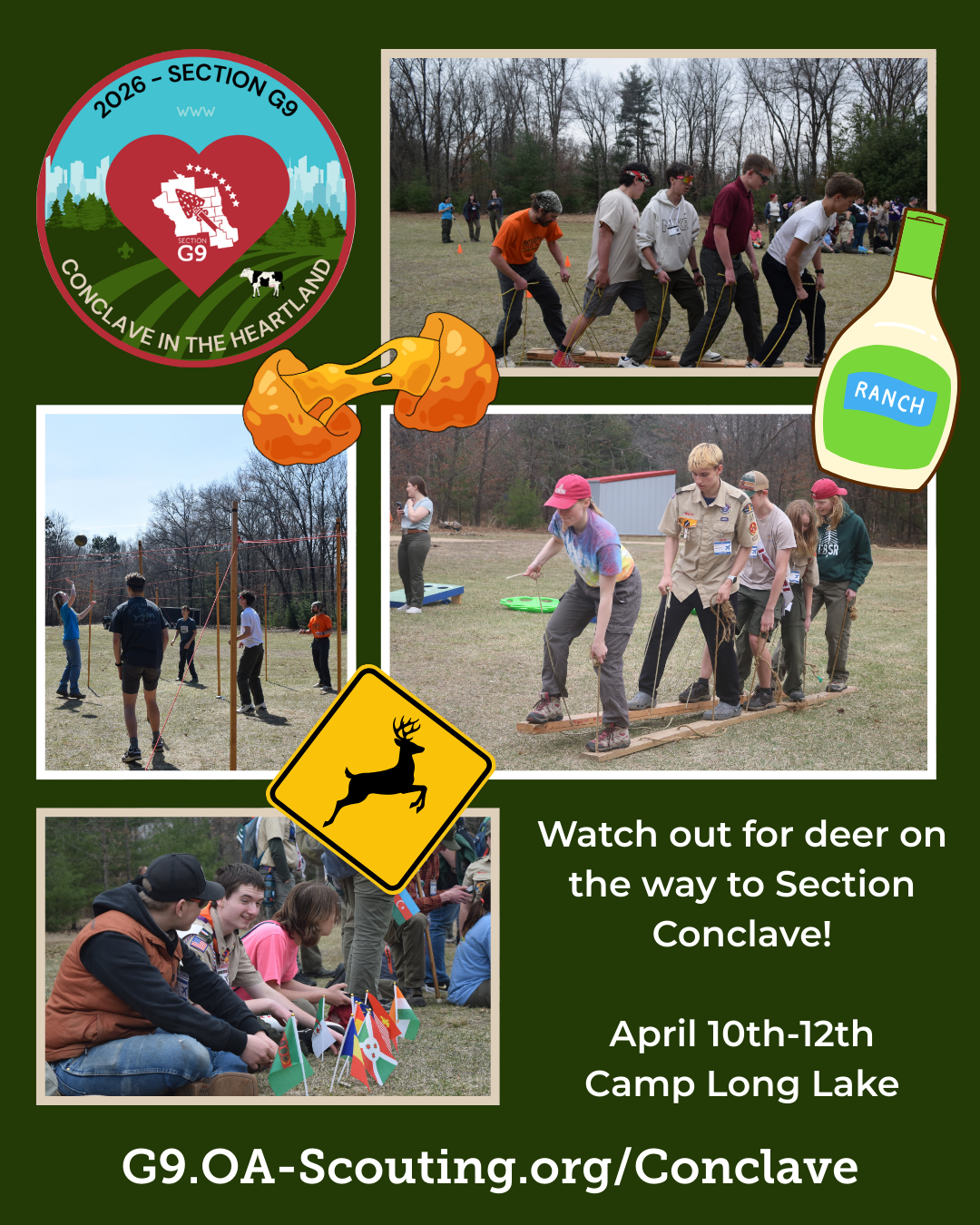 These materials are provided to help lodges and chapters promote the section conclave. Various materials have been created, ranging from OA Lodgemaster emails to social media posts for Instagram and Facebook. Any questions should be directed to the Conclave Promotions Committee at secretary@sectiong9.oa-bsa.org.